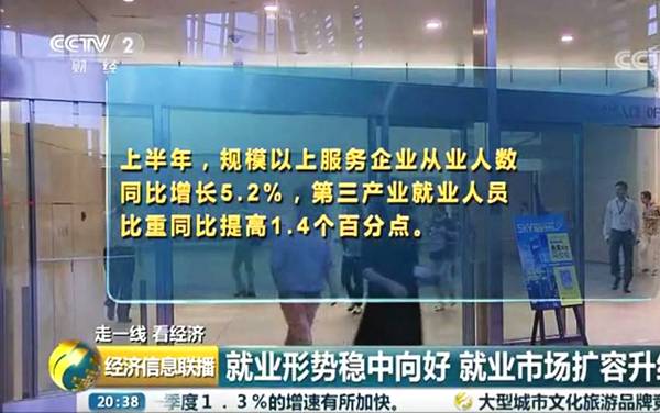 摘要 : 日前,CCTV2央視財經(jīng)頻道《經(jīng)濟信息聯(lián)播》報道:2018年上半年,全國規(guī)模以上服務(wù)企業(yè)從業(yè)人數(shù)同比增長5.2%,第三產(chǎn)業(yè)就業(yè)人員比重同比提高1.4個百分點,就業(yè)形勢穩(wěn)中向好,就業(yè)市場擴容升級。