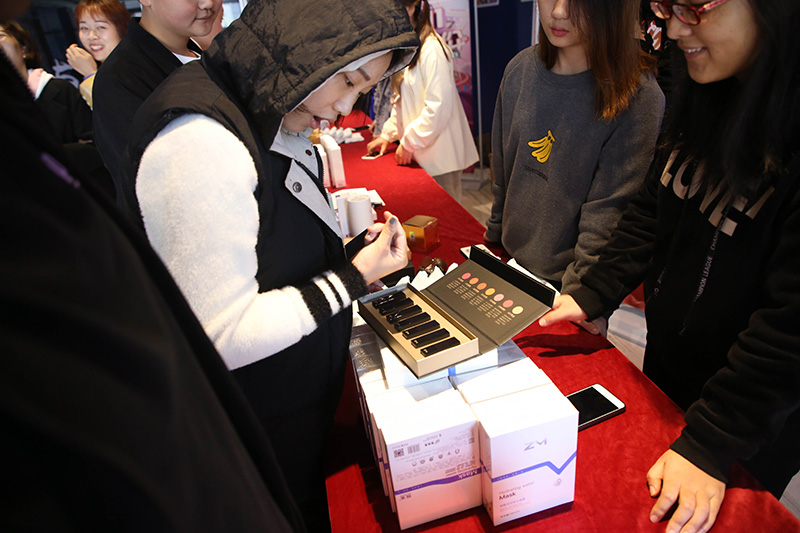11月9日上午11:00前,兩組戰(zhàn)隊便爭分奪秒地在教學樓一樓大廳內進行布置,火紅的擺臺如擂臺一般,有序地擺列著本次銷售產品——瀾庭集護膚品。